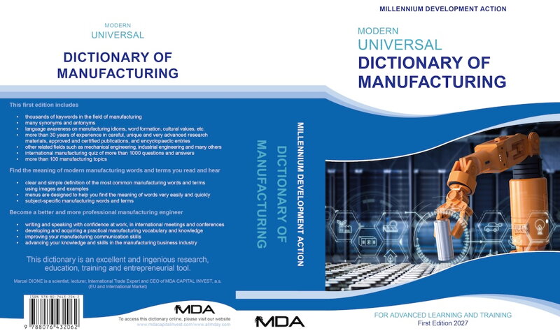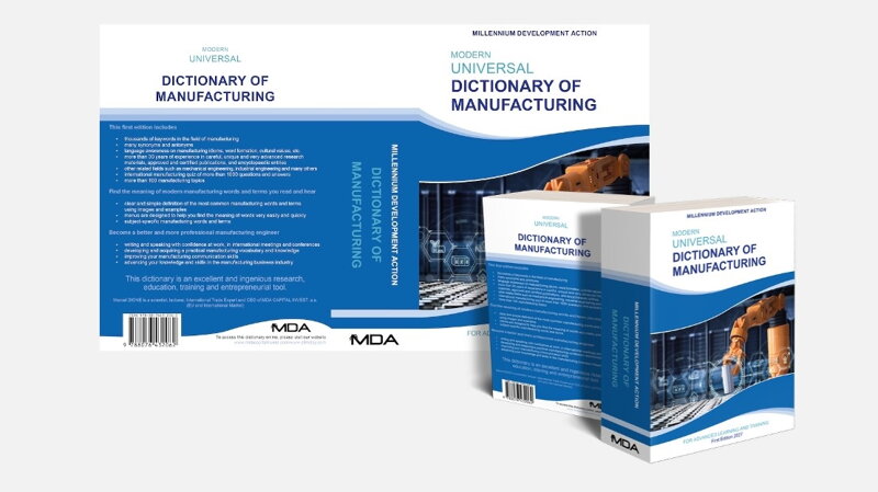 The cover page of the Modern Universal Dictionary of Manufacturing is designed by the Marketa Vabroušková, a professional in graphic design and visual communication, with her primary focus on transforming linguistic messages into graphic manifestations, whether tangible or intangible. This dictionary is published in two formats (electronic publishing and paper publishing) to satisfactorily meet all your needs in manufacturing industry and allied industries.